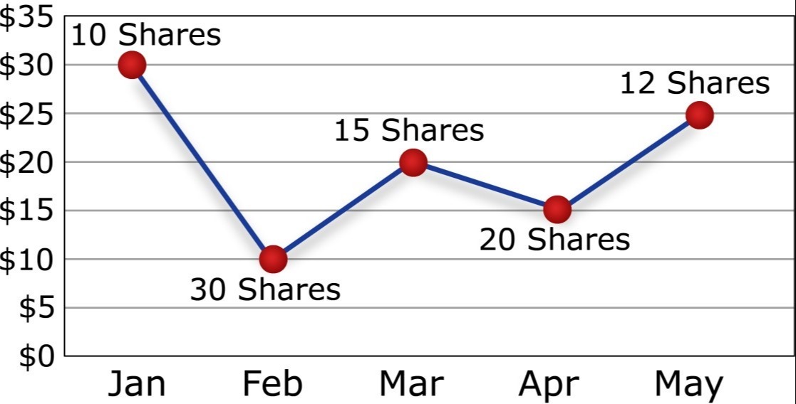 The accompanying graph illustrates how share price fluctuations can yield a lower average cost per share through dollar-cost averaging. In this hypothetical example, ABC Company's stock price is $30 a share in January, $10 a share in February, $20 a share in March, $15 a share in April, and $25 a share in May. If you invest $300 a month for 5 months, the number of shares you would buy each month would range from 10 shares when the price is at $30, to 30 shares when the price is $10. The average market price is $20 a share ($30+$10+$20+$15+$25 = $100 divided by 5 = $20). However, because your $300 bought more shares at the lower prices, the average purchase price is $17.24 ($300 x 5 months = $1,500 invested divided by 87 shares purchased = $17.24).