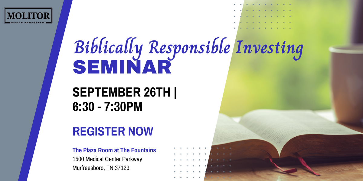 We invite you to join us on September 26th from 6:30-7:30pm in the Plaza Room at The Fountains in Murfreesboro for a seminar covering biblically responsible investing, which is an intentional approach to wealth management that chooses investments that align with your beliefs as a follower of Christ and avoids companies that are engaged in immoral practices.