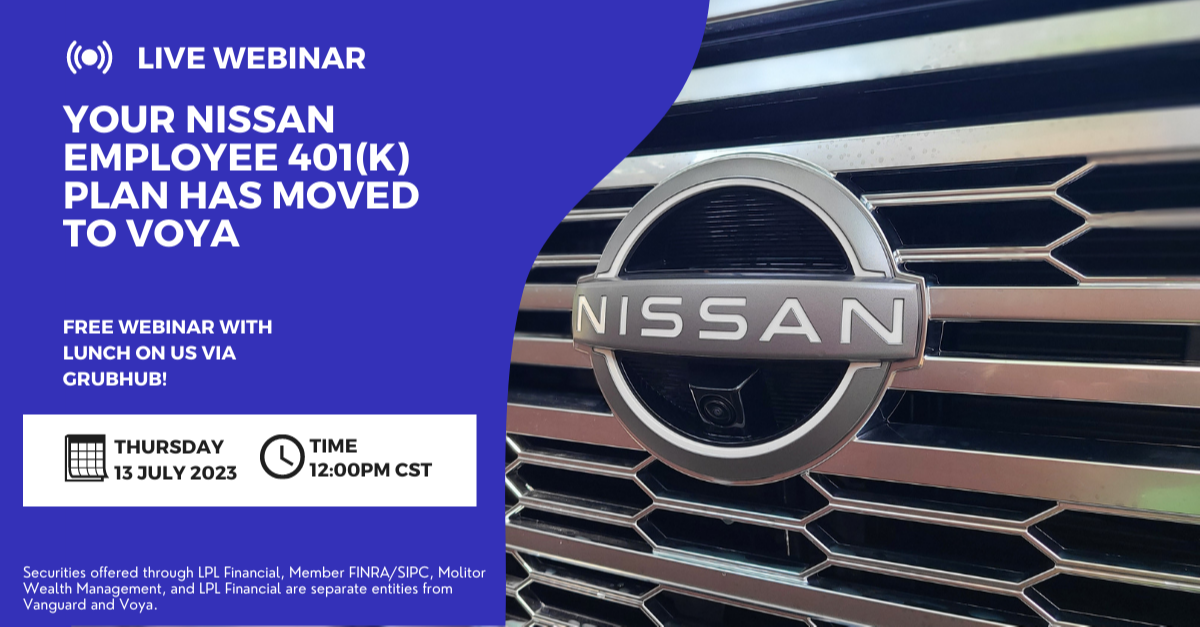 Molitor Wealth Management specializes in retirement planning; however, they, nor the firms they are associated with, are affiliated, endorsed, nor retained by Nissan, Vanguard or Voya. This workshop is not intended to induce you to retire.